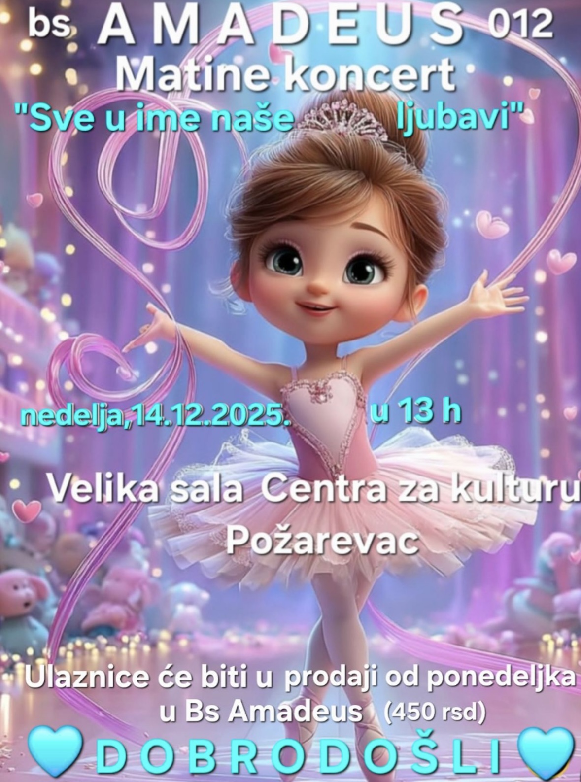 Na sceni će zablistati mlade balerine Baletskog studija Amadeus 012, noseći publiku kroz nežne pokrete, muziku i emociju — sve u ime ljubavi.